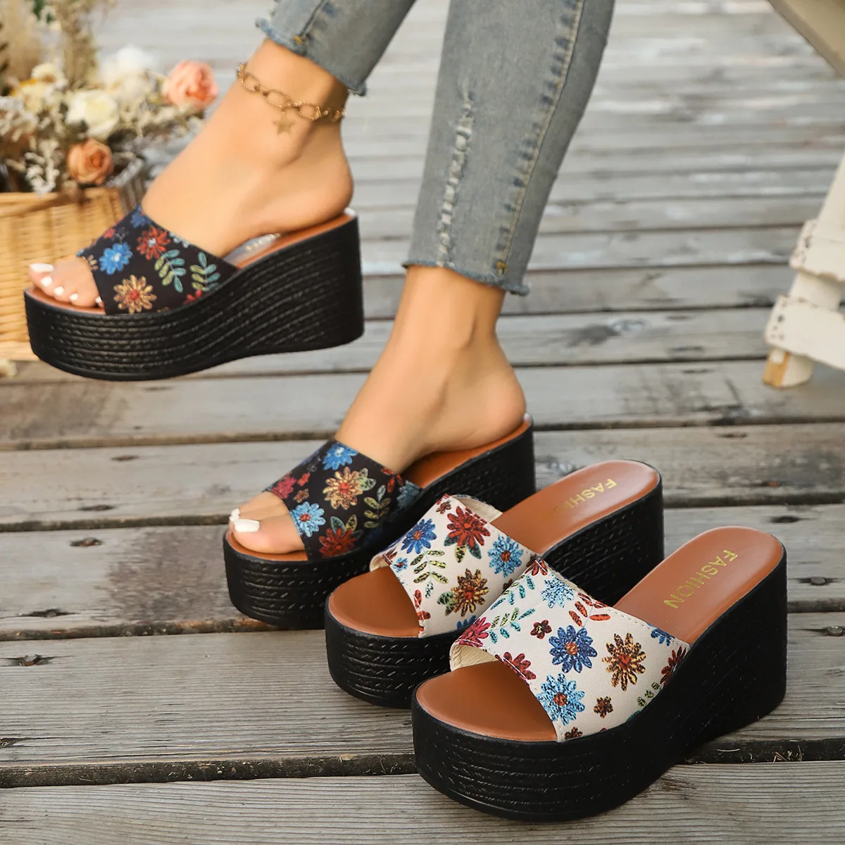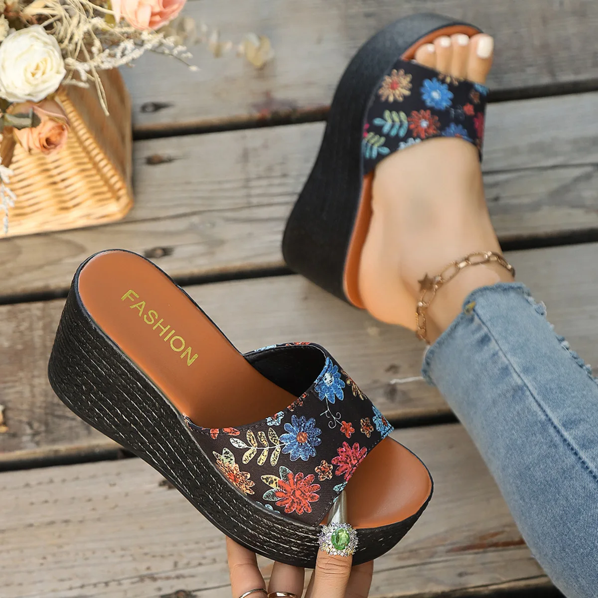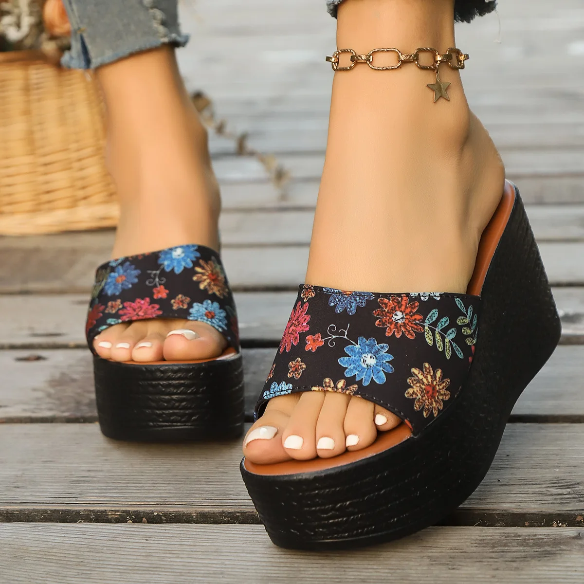 QuiteS 2026 Women's Elegant Casual Floral Design Sunflower Fabric One-Strap Large Size Thick-Soled Wedge Platform Outdoor